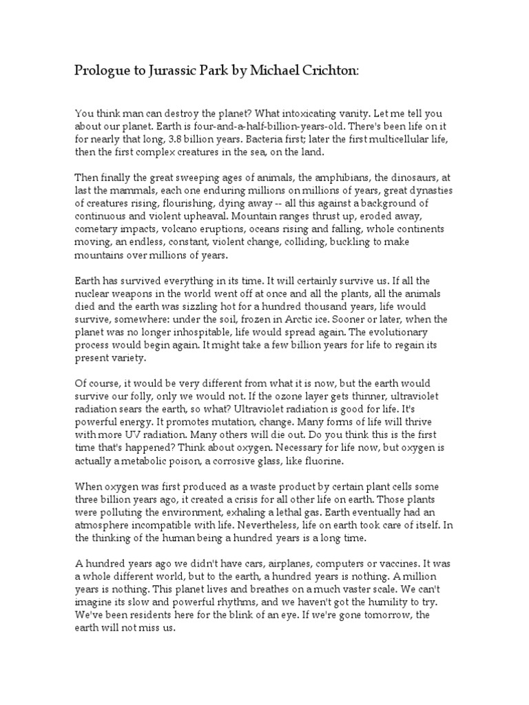 Prologue To Jurassic Park By Michael Crichton Pdf Earth Life